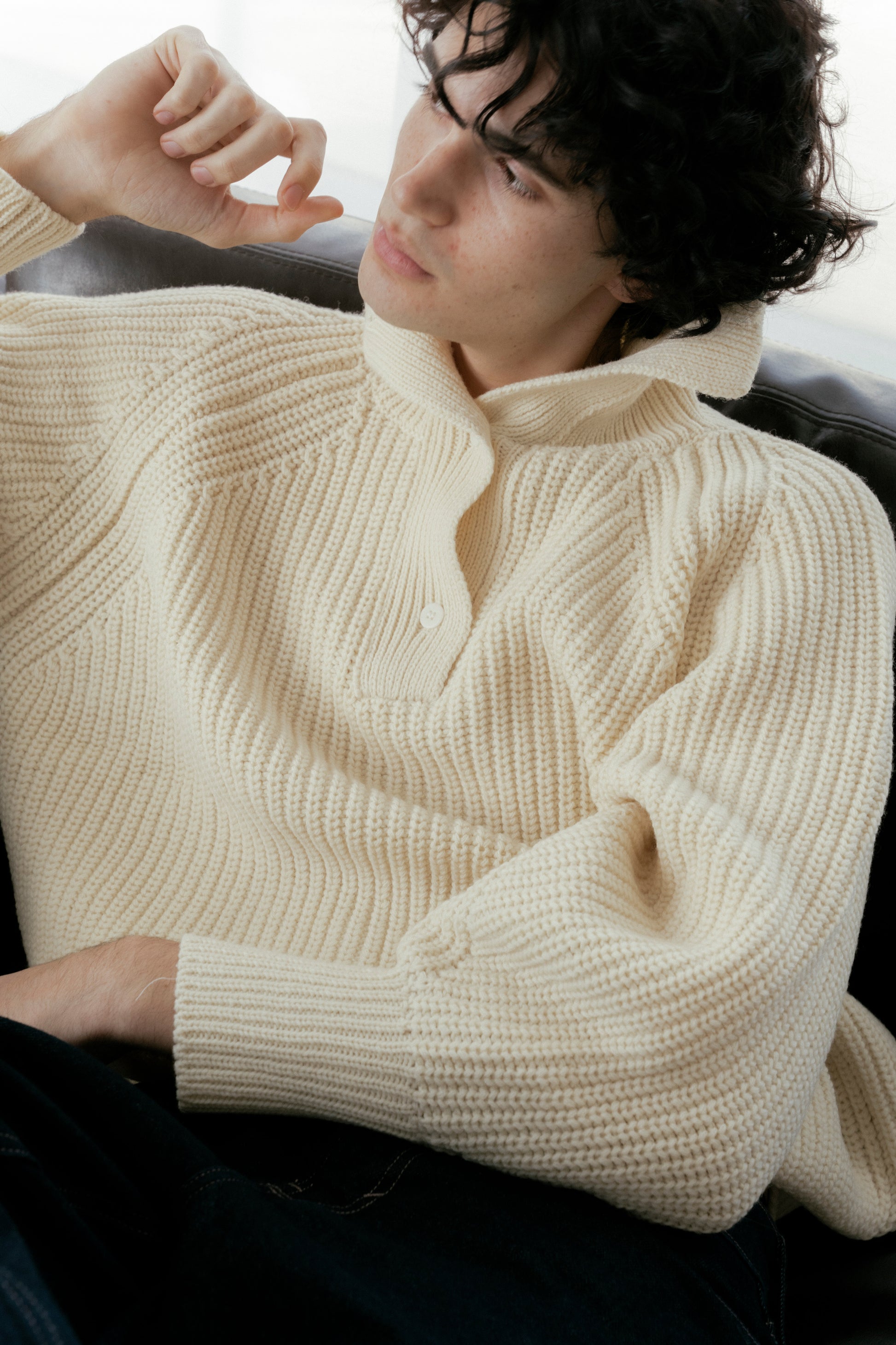 Suéter sin género de peso medio tejido en canalé de pescador de 4 capas, cuello cómodo que se puede abotonar para una sensación más cálida o desabrochar para una apariencia aireada.