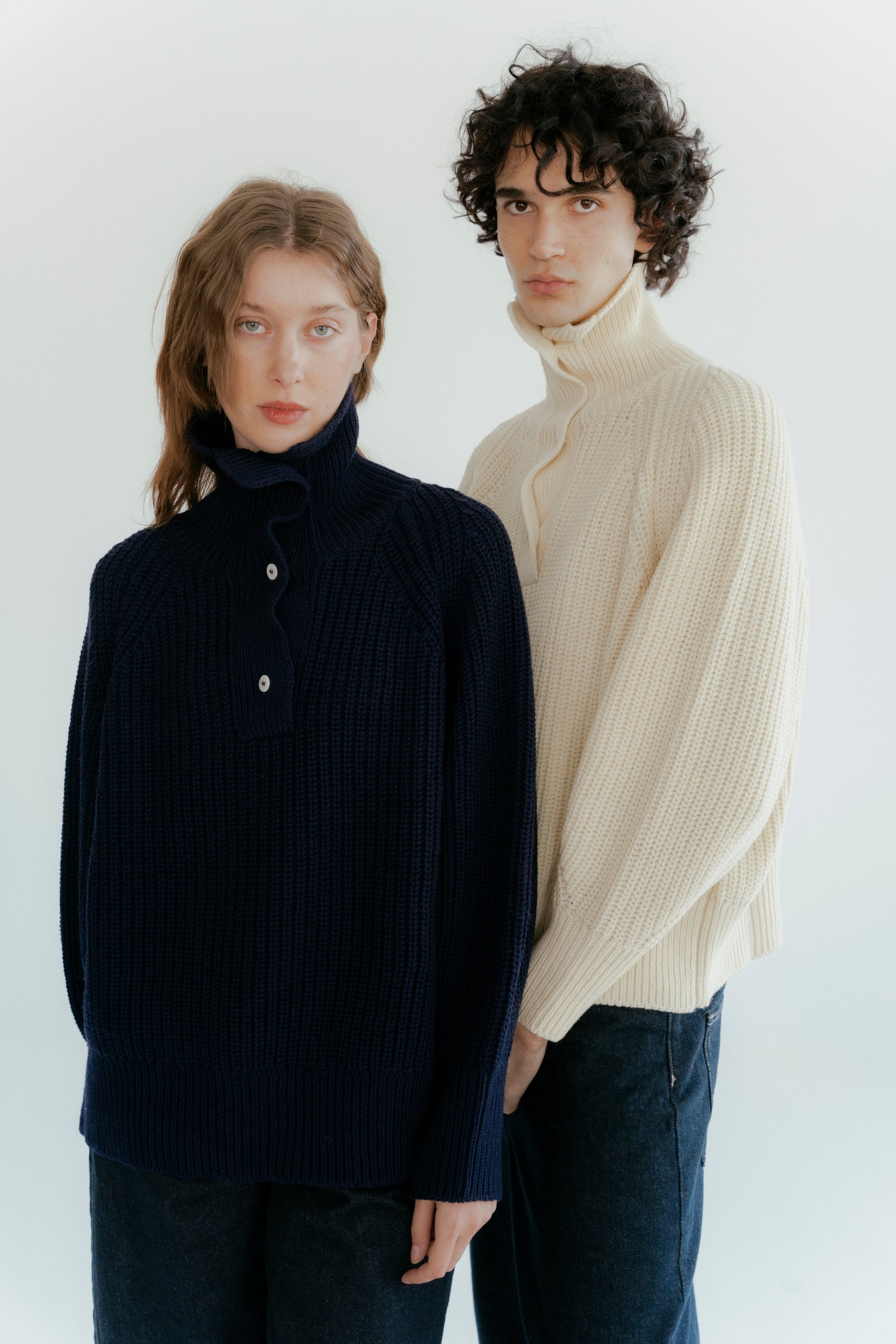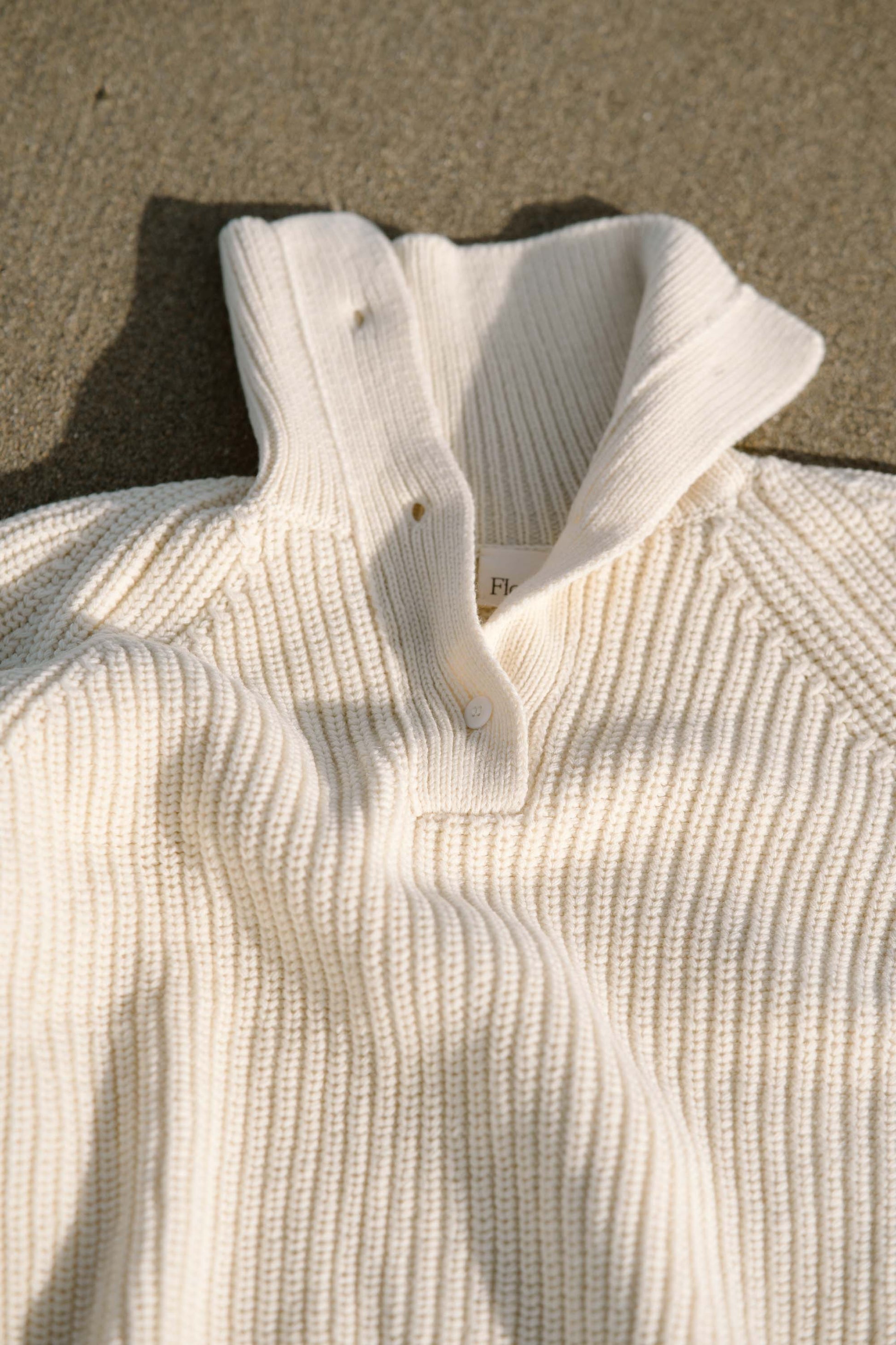 Midweight genderless sweater knitted in 4 ply fishermans rib, comfortable collar that can be buttoned up for a warmer feeling or unbuttoned for an airy look.